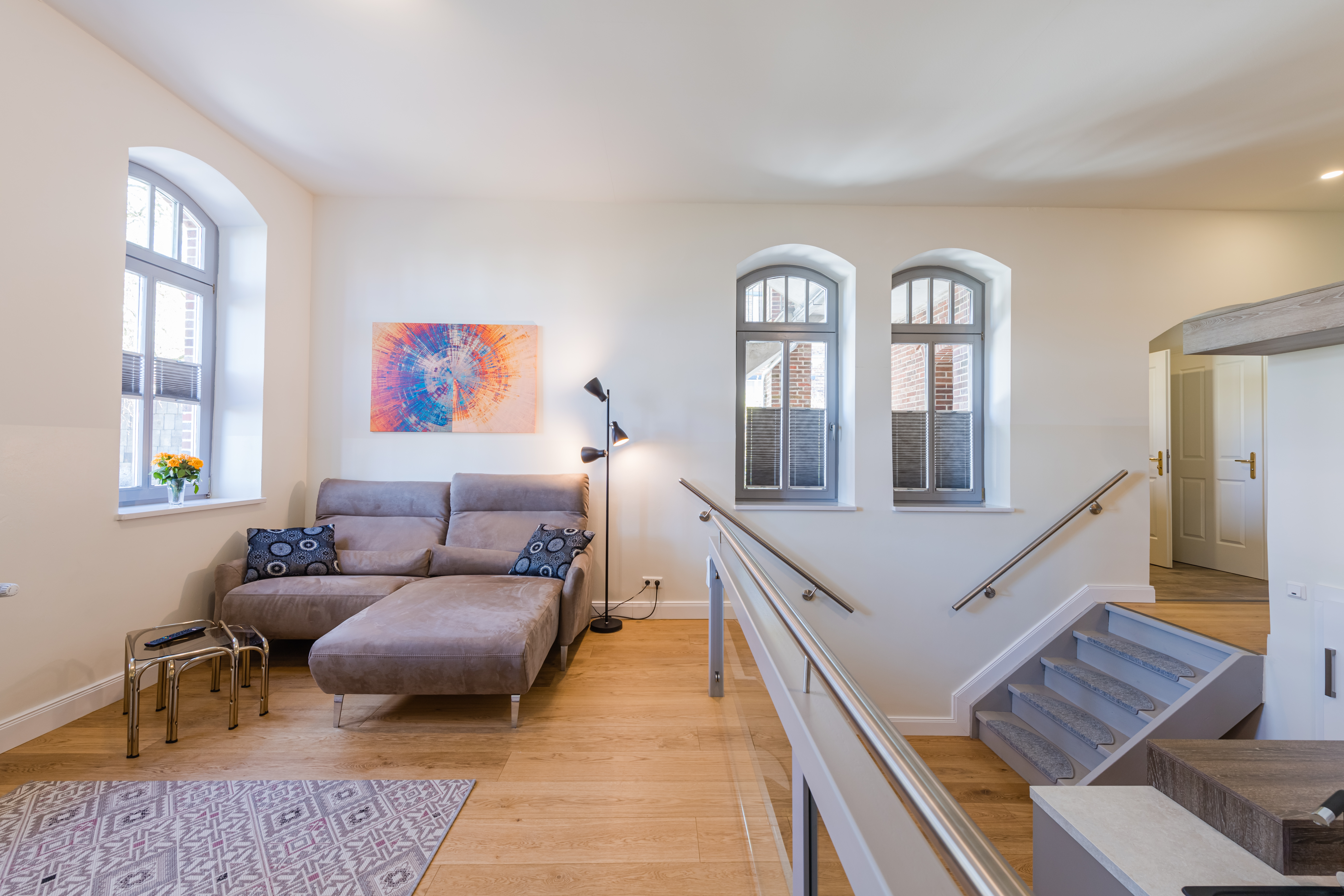 Das Schlafzimmer befindet sich auf der oberen Ebene der Wohnung.